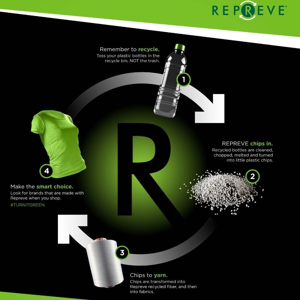 - REPREVE® es la fibra líder y más confiable, hecha de materiales reciclados (incluyendo botellas de plástico).