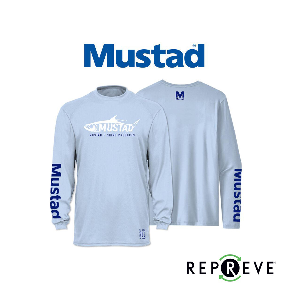 REMERA MUSTAD «TARPON CELESTE» REPREVE® te mantiene fresco y cómodo pescando, es lo ideal con esta remera técnica de Mustad. Las remeras técnicas de Mustad son ideales para salir al agua con protección SPF50 +.